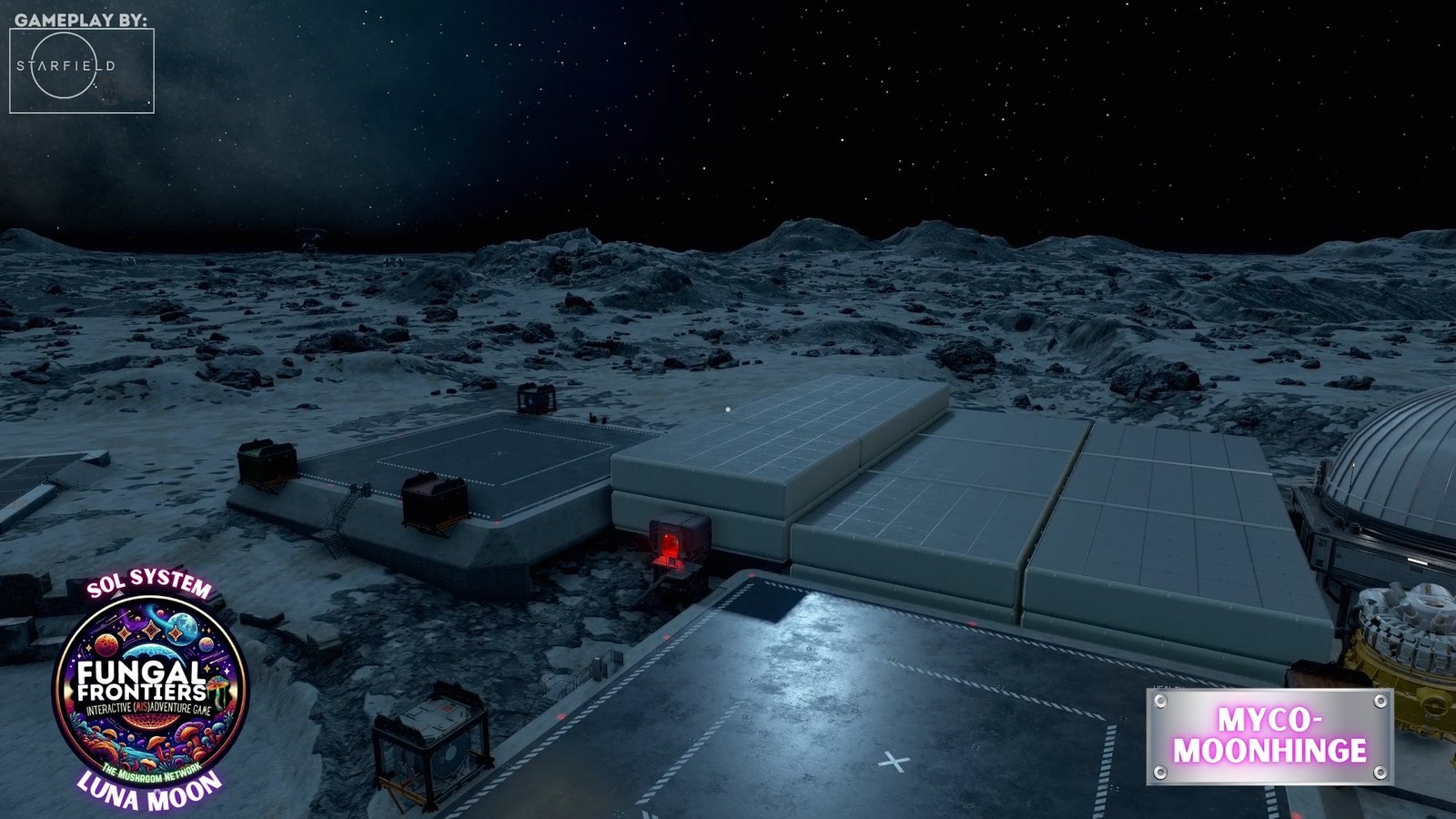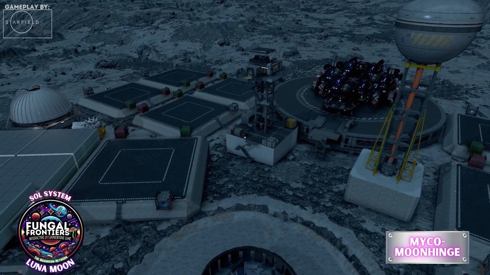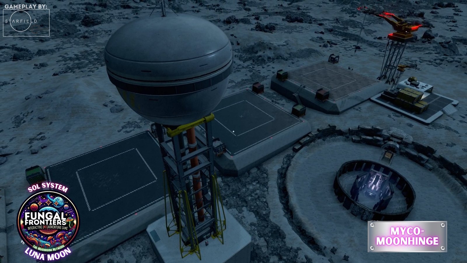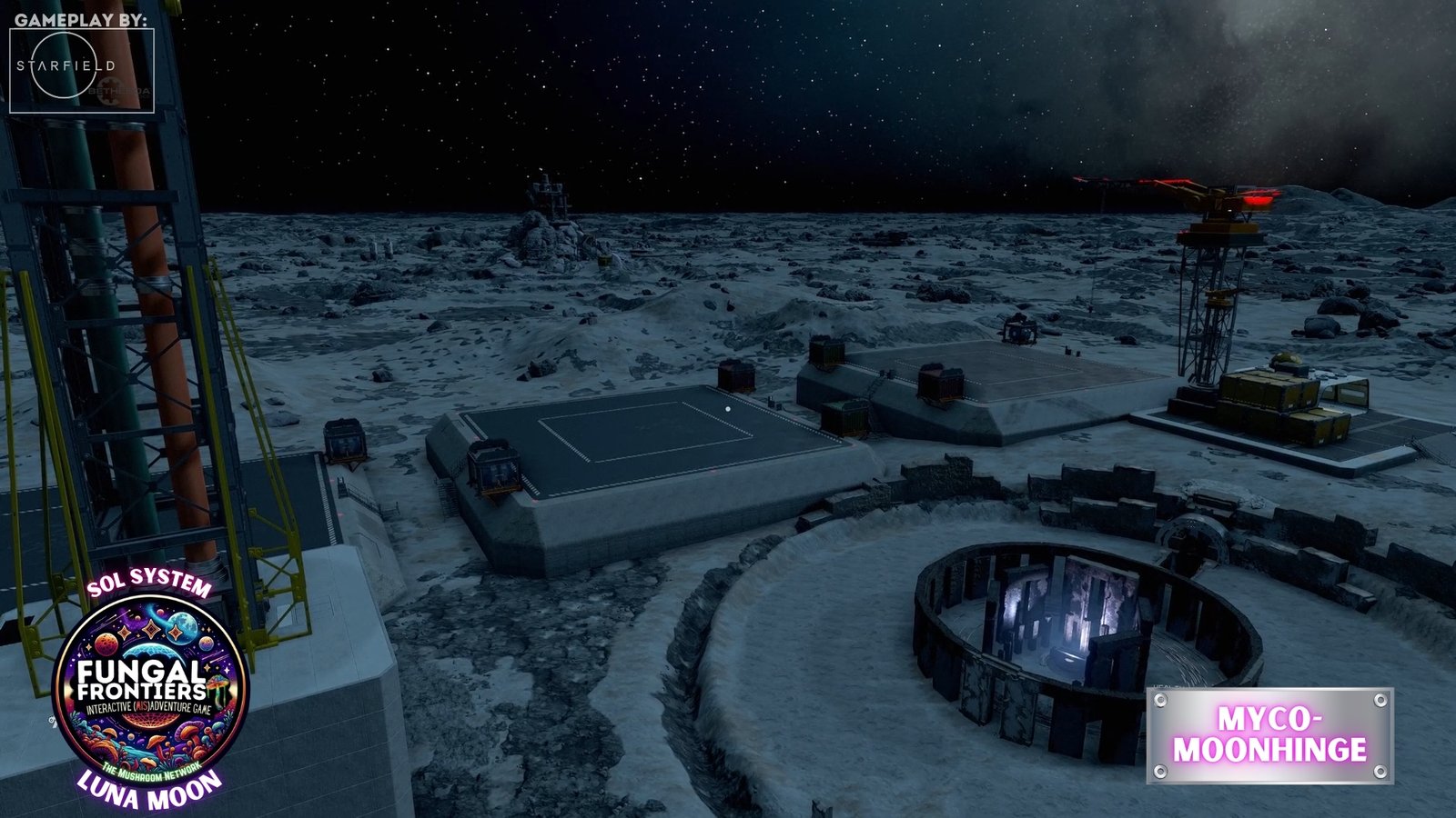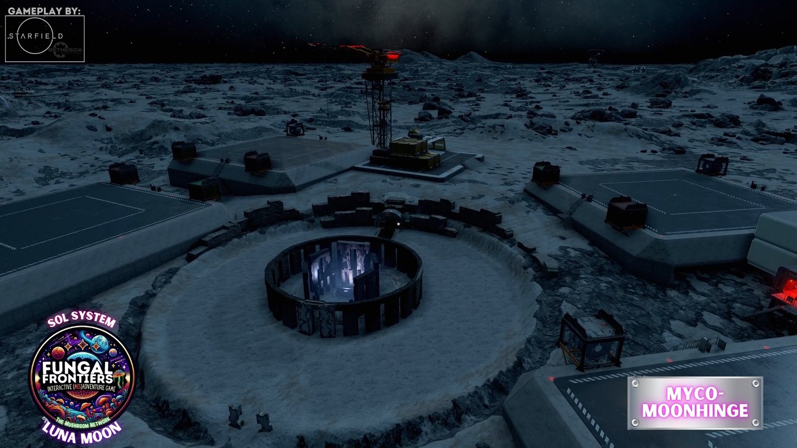 Myco-Moonhenge stands as a CRTCA-operated lunar outpost where ancient fungal mysticism converges with advanced orbital transport infrastructure. Situated on Luna within the Sol system, this installation seamlessly integrates the remnants of a sacred site once aligned to the Grand Cosmic Mycelial Network, which has now become one of the busiest docking nexuses in the Sol System, serving as the premier space cruise port and intergalactic transfer station for vessels of all sizes.