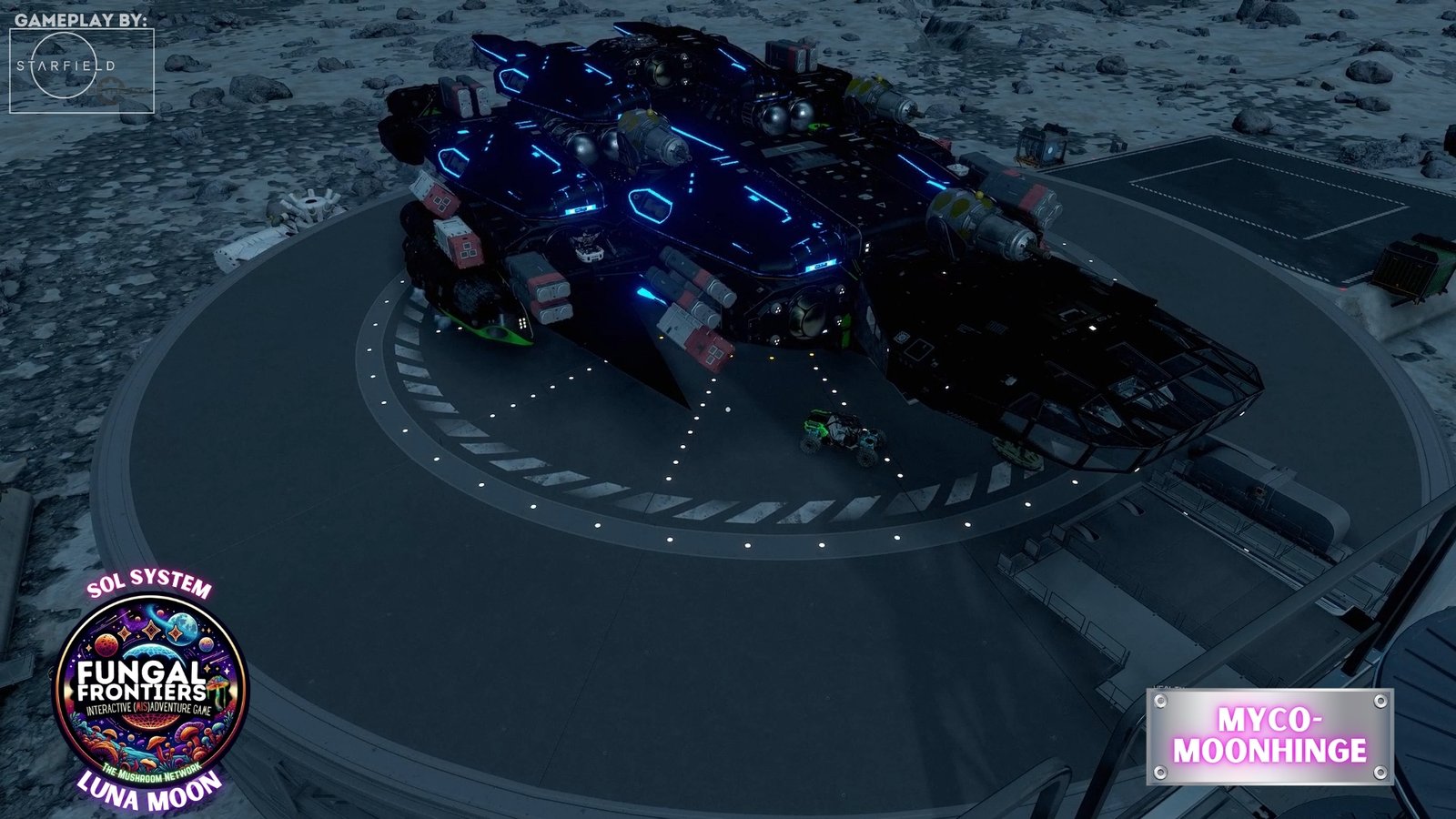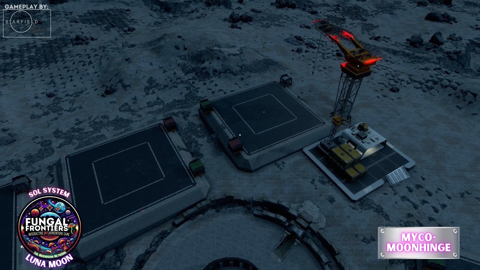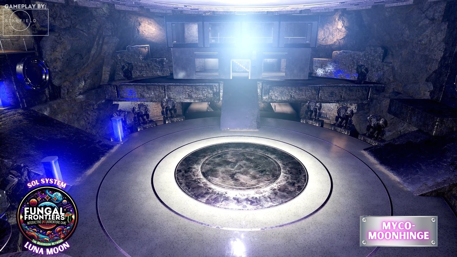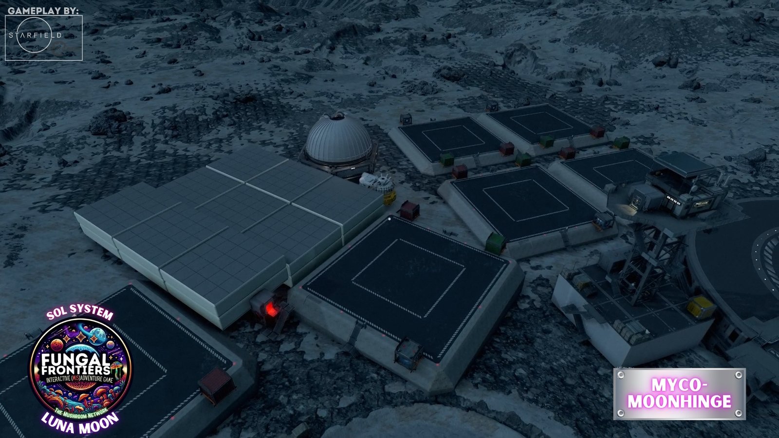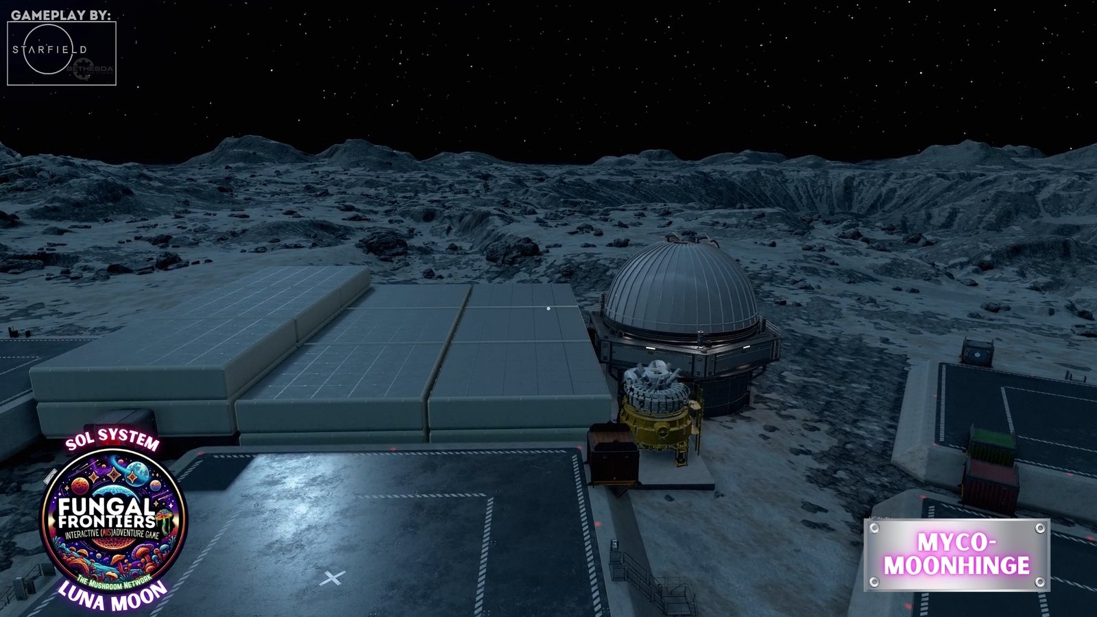 Myco-Moonhenge stands as a CRTCA-operated lunar outpost where ancient fungal mysticism converges with advanced orbital transport infrastructure. Situated on Luna within the Sol system, this installation seamlessly integrates the remnants of a sacred site once aligned to the Grand Cosmic Mycelial Network, which has now become one of the busiest docking nexuses in the Sol System, serving as the premier space cruise port and intergalactic transfer station for vessels of all sizes.